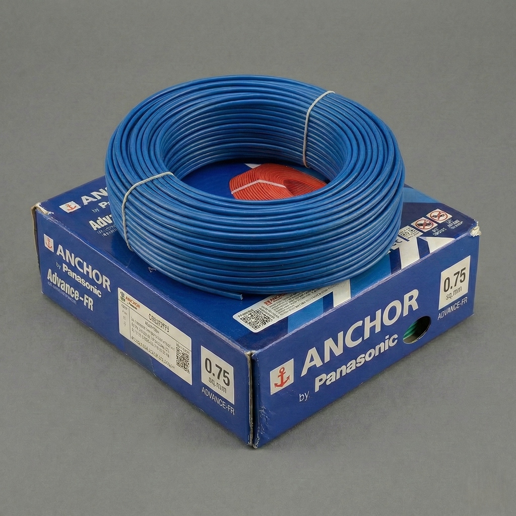 Advance-FR multicore copper wire — 0.75 sq.mm, 90m coil in blue. Flame-retardant PVC insulation and flexible annealed copper conductors provide reliable household and lighting wiring, switch and appliance connections. Corrosion-resistant, easy to install, IS-compliant quality — ideal for electricians and DIY installers.
