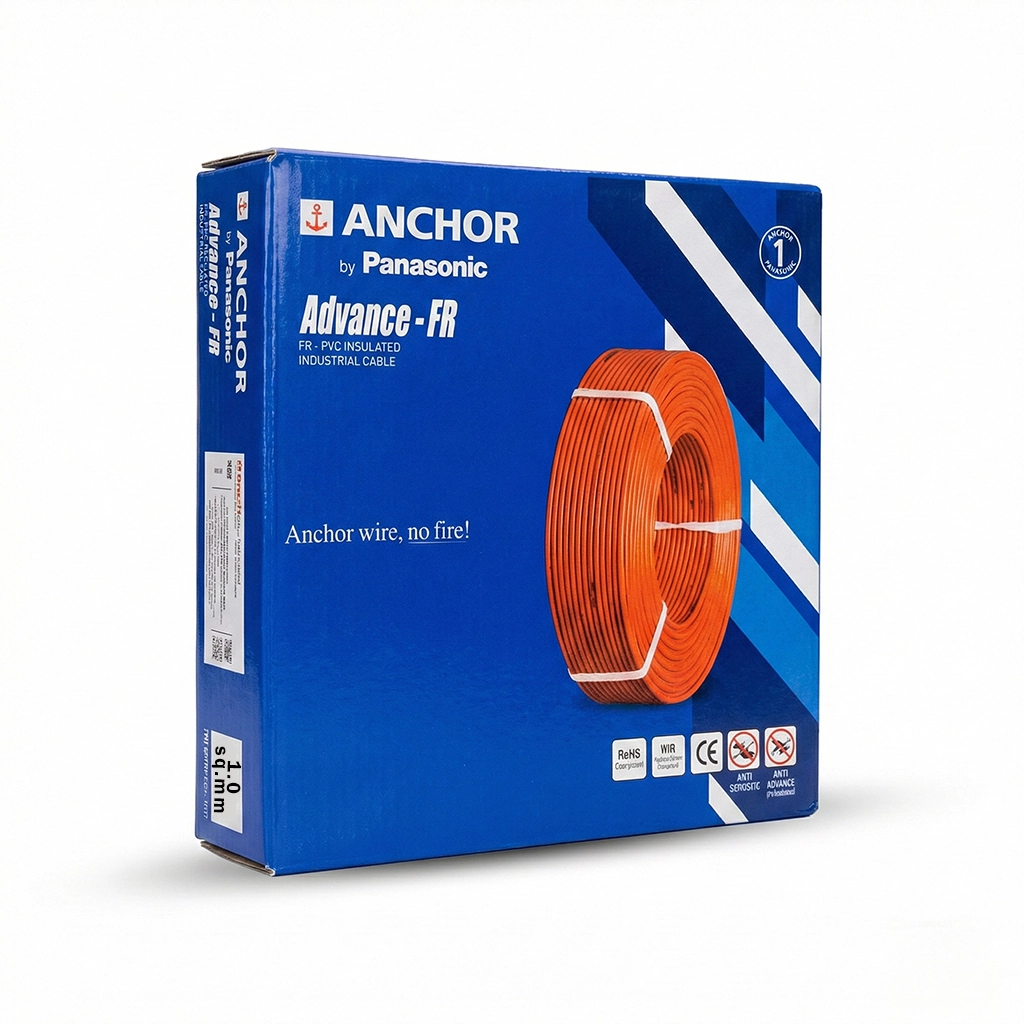 Anchor by Panasonic Advance-FR 1.0 sq.mm multicore copper wire in 90m green coil ensures superior conductivity and enhanced safety with flame-retardant PVC insulation. Ideal for earthing, home wiring, lighting circuits and switchboard connections. Flexible, durable and IS-compliant—perfect for residential and commercial electrical projects.