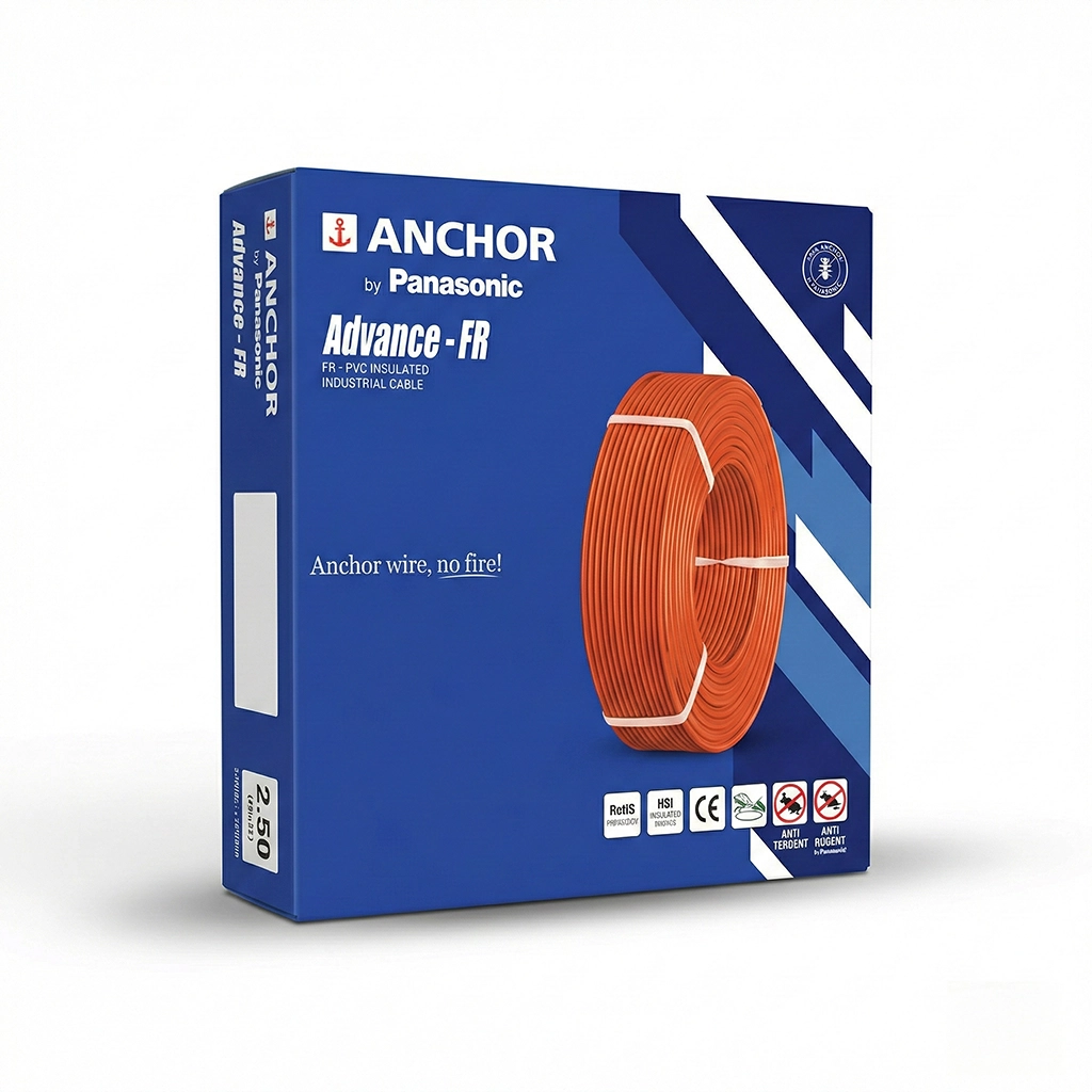 Anchor by Panasonic Advance-FR 2.5 sq.mm multicore copper wire in 90m red coil delivers high current-carrying capacity and enhanced fire safety with flame-retardant PVC insulation. Ideal for phase wiring, heavy-load circuits, power sockets and commercial installations. Flexible, durable and IS-compliant—trusted by electricians across India.
