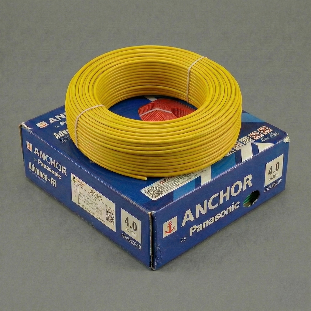 Anchor by Panasonic Advance-FR 4.0 sq.mm multicore copper wire in 90m yellow coil ensures superior current capacity and flame-retardant PVC insulation for enhanced safety. Ideal for heavy-duty power wiring, distribution boards, main supply lines and commercial installations. Flexible, durable and IS-compliant—engineered for reliable high-load performance.
