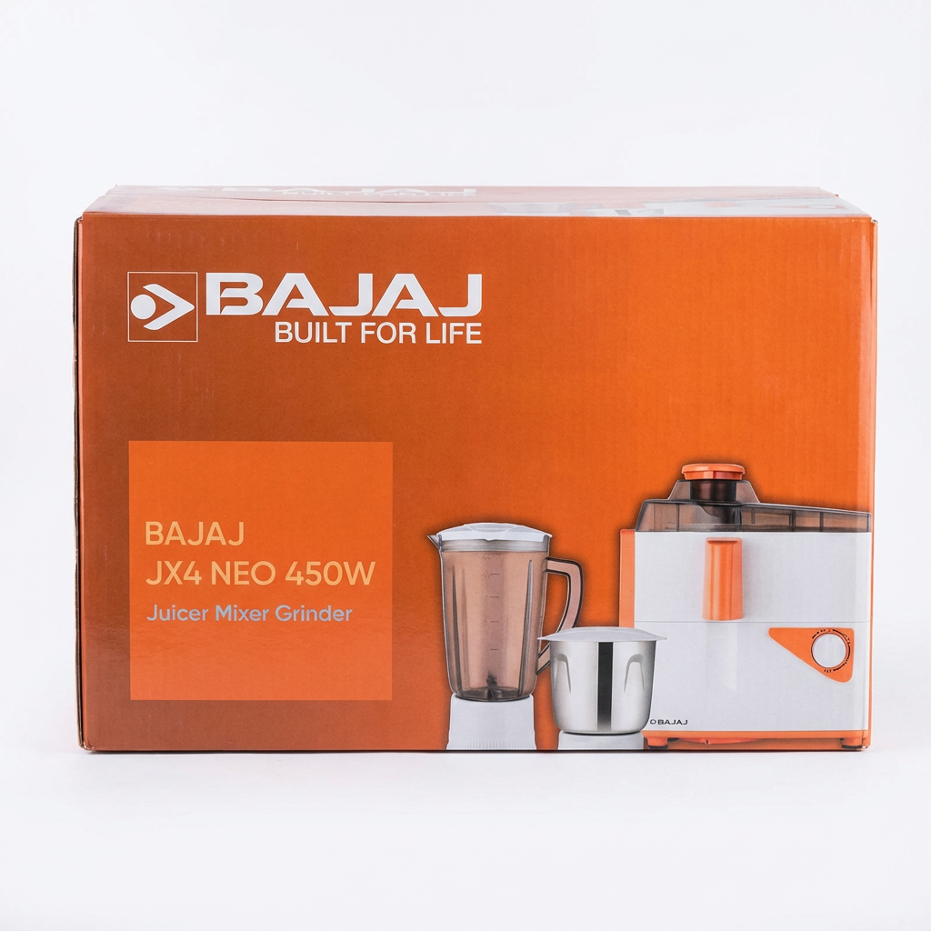 Prepare fresh juices, smoothies, chutneys, and spice mixes effortlessly with the Bajaj JX4 Neo 450W juicer mixer grinder. Equipped with a powerful 450W motor, efficient juicer attachment, durable stainless steel jars, and compact design for everyday use. Ideal for Indian kitchens seeking reliable performance, easy operation, and space-saving convenience.
