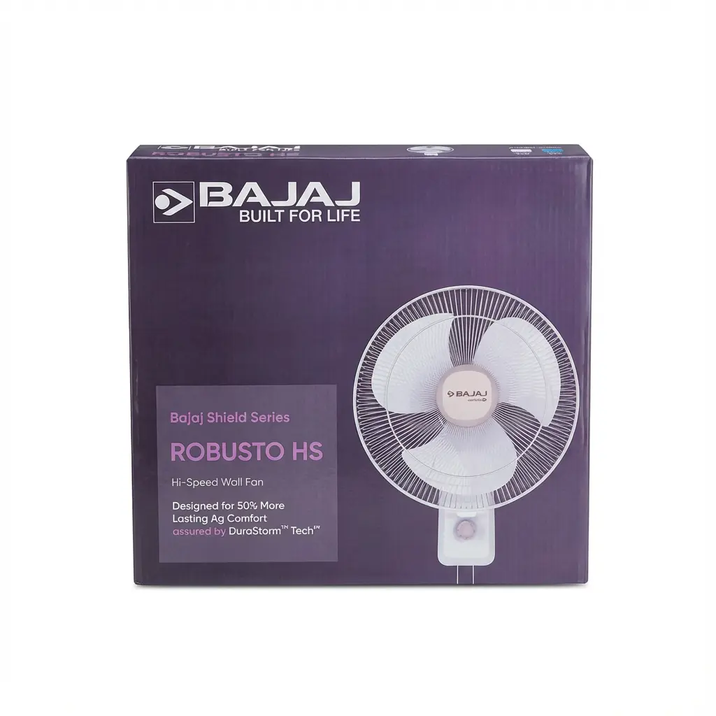 Beat the heat with the Bajaj Robusto HS 400mm high-speed wall fan, designed for powerful air delivery and long-lasting performance. Featuring a sturdy metal body, aerodynamic blades, and DuraStorm™ technology, it ensures wider air throw and reliable cooling. Ideal for Indian homes, shops, and offices seeking efficient, space-saving wall-mounted cooling.
