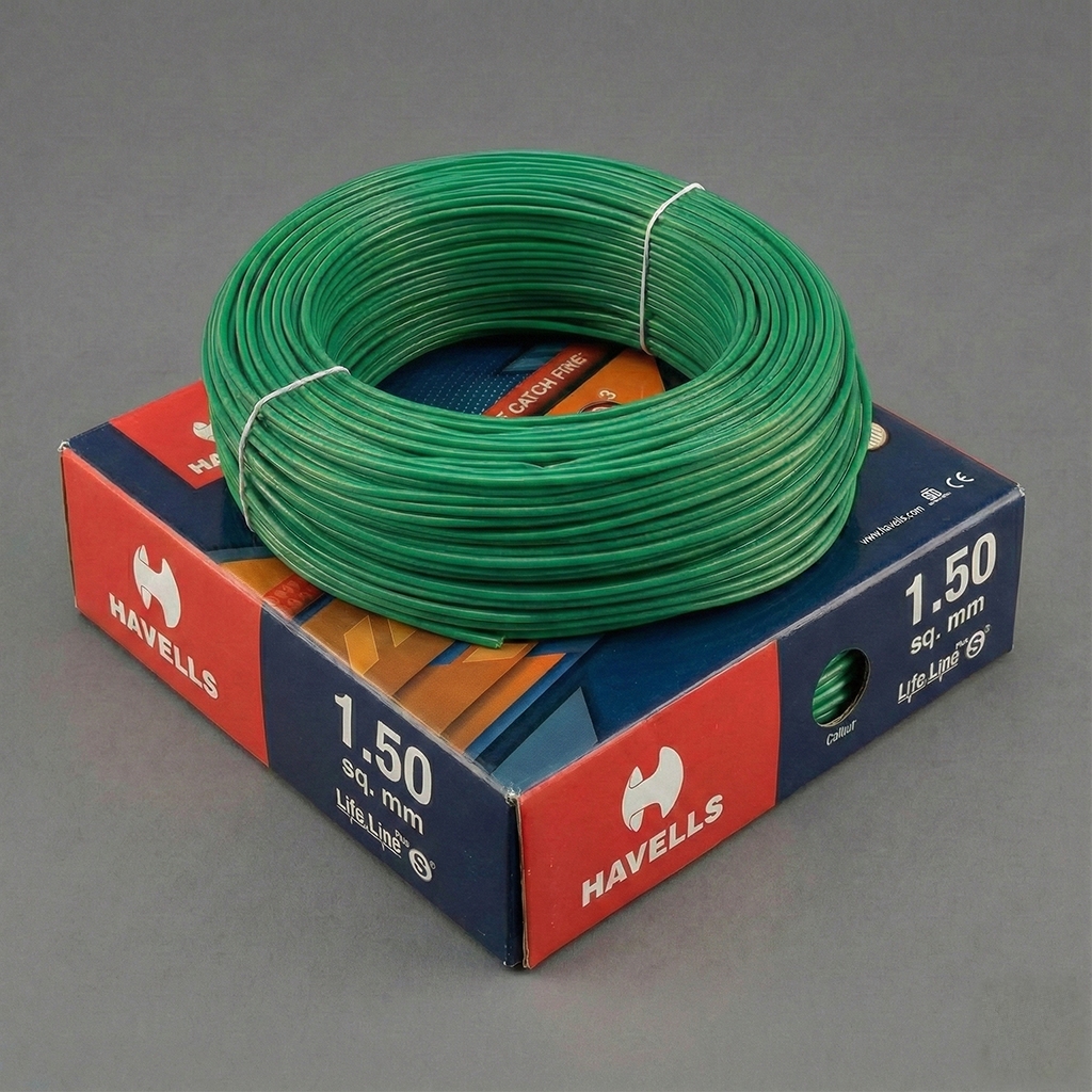 Buy Havells LifeLine 1.5 sq.mm multicore copper wire (90m, Green) designed for safe and reliable electrical wiring. Made from high-conductivity copper with durable FR PVC insulation for enhanced fire safety. Ideal for residential and commercial power circuits, switchboards and earthing applications. Flexible, long-lasting and IS compliant.