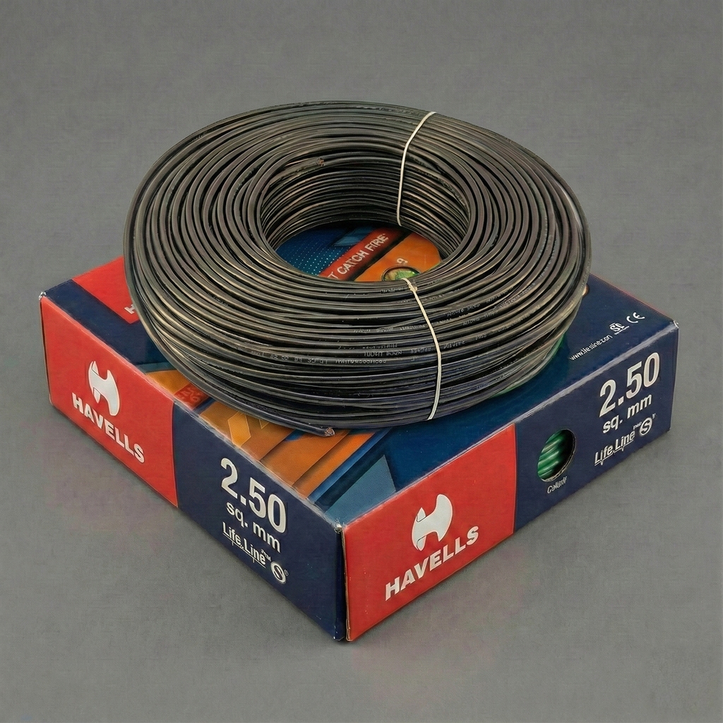 Purchase Havells LifeLine 2.5 sq.mm multicore copper wire (90m, Black) for heavy-duty electrical wiring. Made with high-purity copper and flame-retardant PVC insulation, it delivers superior conductivity, safety and durability. Ideal for power circuits, AC wiring, sockets and residential or commercial installations. IS compliant and long-lasting.